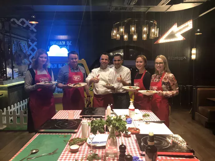 Deshalb hat das Team von unserem Büro in Moskau eine solche Entscheidung getroffen, ein Betriebsfest in dem Restaurant „Jamie's Italian“ zu feiern, in dem sie selbst Fisch zubereitet haben.